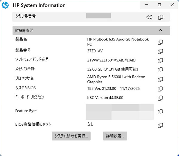 HPのSystem Informationアプリから。