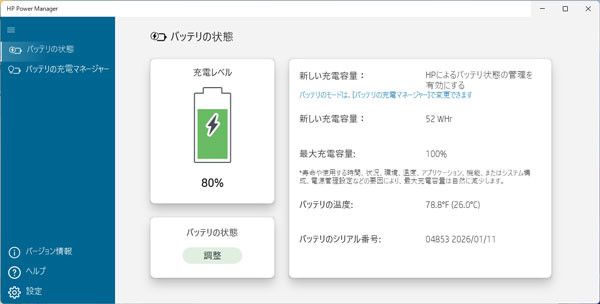 バッテリーの状態。52Whに交換して、充電はバッテリーの持ちを考慮した充電になっています。