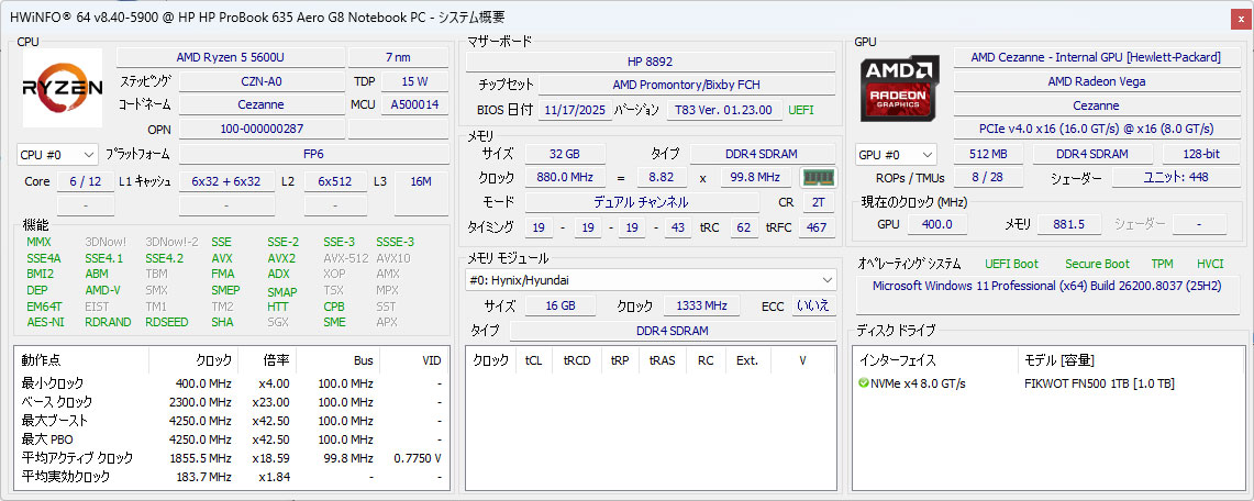 HP ProBook 635 Aero G8の現在の仕様
