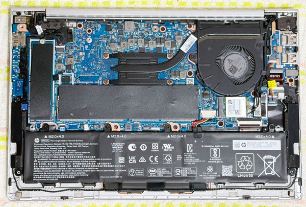 アルミのシールドの下にメモリのSO-DIMM、左下に2.5インチSSD、その上にM.2 SSDが付いています。