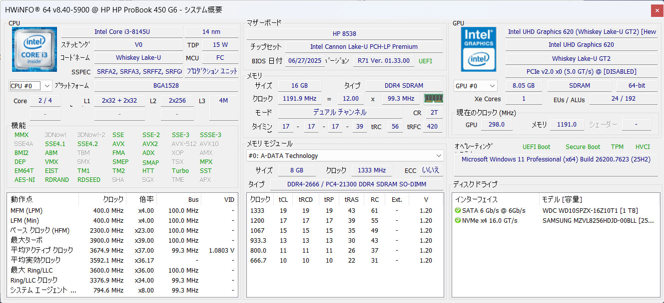 | CPU | Intel | Core i3-8145U (Whiskey Lake) (2.10 GHz/2コア/4スレッド/L3 4MB) |